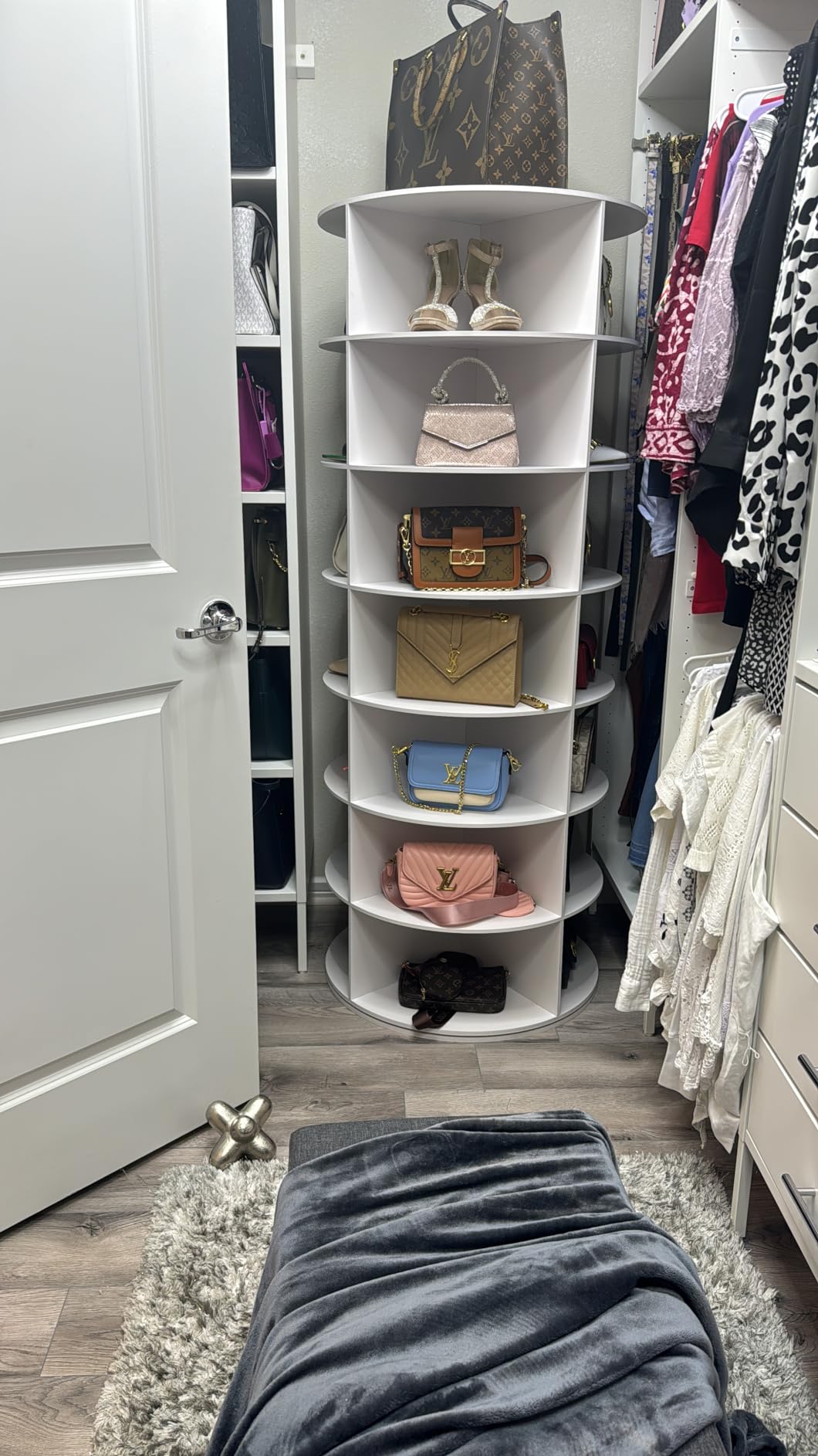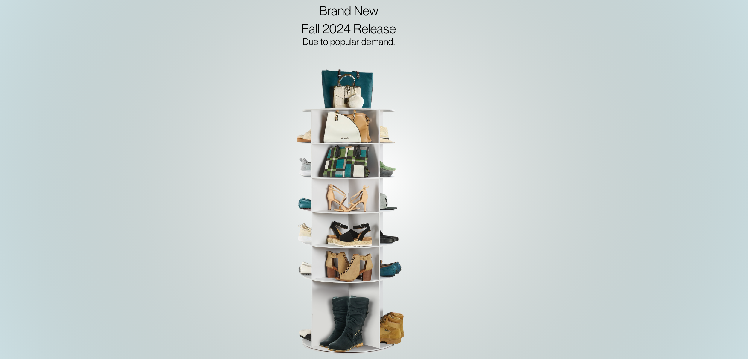 - Enjoy the ease of a shoe carousel with our rotating shelf organizer. The spin feature lets you browse your collection effortlessly, adding convenience and style to your closet.