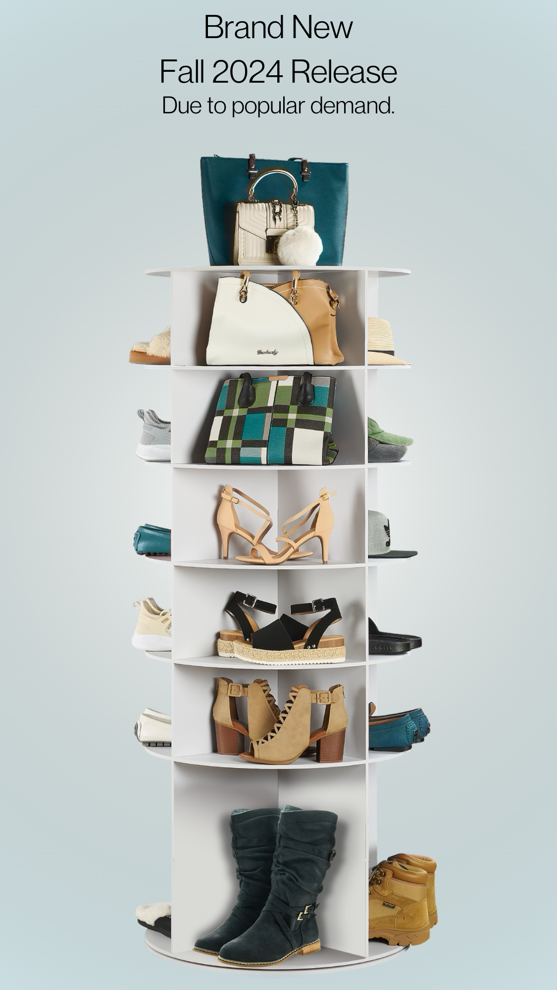 - Optimize your storage with our spinning shoe rack tower. The lazy susan design ensures efficient organization, keeping your shoes neatly arranged and easy to view.